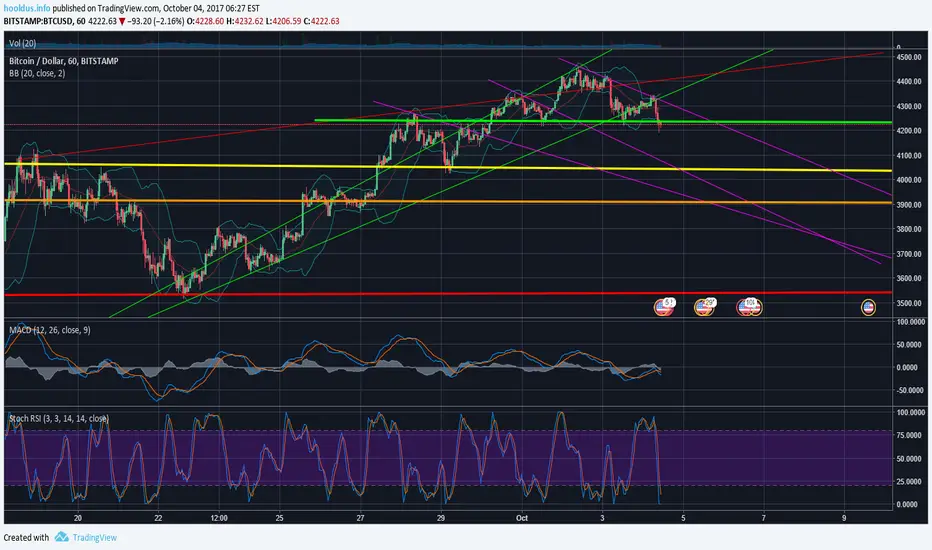 As we see BTC has fallen a little below green line, if It doesn't get support on green line then next stop may be yellow line going through purple lines until yellow or orange it depends does where it will get it's support. but in my opinion yellow line is coming..